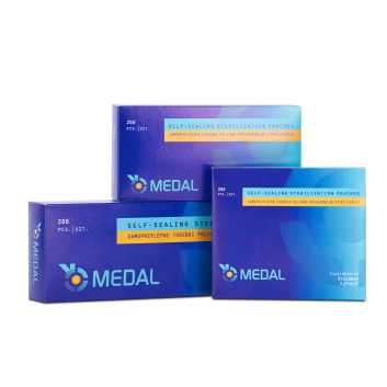Torebki papierowo-foliowe samoprzylepne przeznaczone do sterylizacji nasyconą parą wodną, tlenkiem etylenu oraz formaldehydem (przy zastosowaniu odpowiedniego wskaźnika).