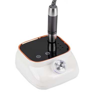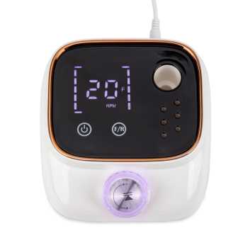 Profesjonalna frezarka do paznokci z dużym i czytelnym wyświetlaczem LCD to połączenie funkcjonalności i elegancji. Urządzenie oferuje maksymalną prędkość 45 000 obr./min, intuicyjne dotykowe przyciski oraz podświetlane diamentowe pokrętło, które nie tylko reguluje prędkość, ale również pozwala na pauzę na wybranym poziomie obrotów.