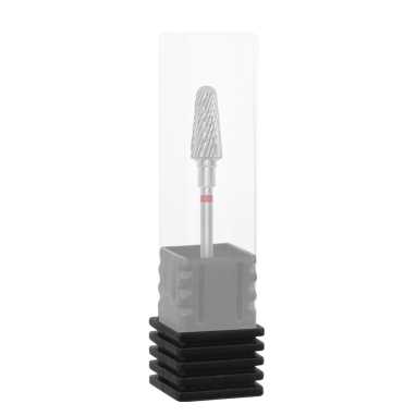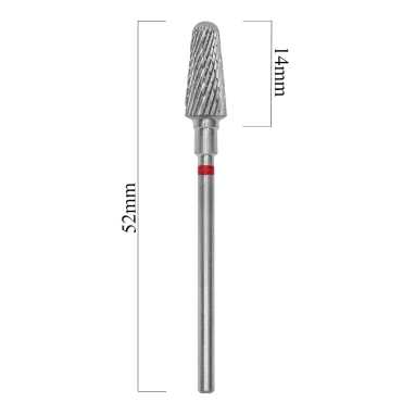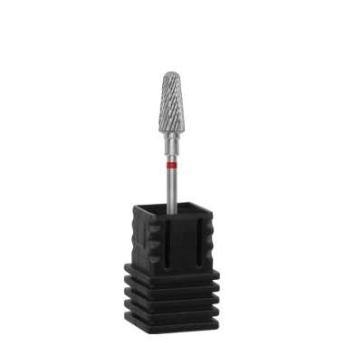 Czerwone nacięcie o miękkiej ziarnistości, oznacza delikatne cięcie poprzeczne (twardość frezu zależy od liczby i głębokości ostrzy). Kształt "ściętego stożka" do korekty sztucznych paznokci, usuwania sztucznego materiału, obróbki skóry stóp i poduszek palców.