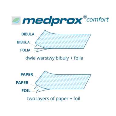 Medprox Comfort to higieniczny podkład ochronny o szerokości 30cm i perforacji co 50cm, składający się z 3 warstw: dwóch warstw bibuły oraz warstwy foliowej. Podkład Medprox Comfort zapewnia wysoki poziom higieny podczas realizowanych zabiegów.
