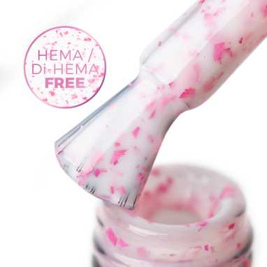 Flakes Rubber Base MollyLac to produkt 2w1 czyli elastyczna baza o mlecznym kolorze wzbogacona różowo-metalicznymi kawałkami folii.