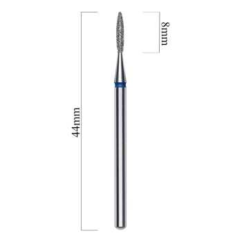 Niebieski frez o średniej ziarnistości do najdelikatniejszej obróbki skóry, odpowiedni dla początkującego i doświadczonego stylista. Kształt "Ostry płomień" do obróbki skórek, wałków bocznych, zgrubień bez ryzyka uszkodzenia skóry.