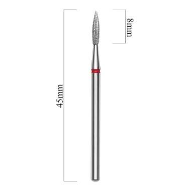 Czerwony frez o miękkiej ziarnistości do najbardziej delikatnego opracowania skóry, odpowiedni dla początkujących i profesjonalnych stylistów. Kształt "Ostry płomień" do obróbki skórek, wałków bocznych, zgrubień bez ryzyka uszkodzenia skóry.