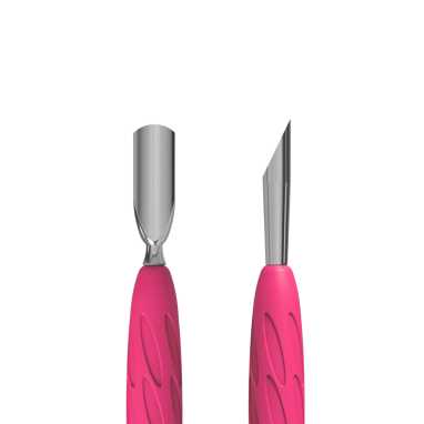 Część robocza "kopytka skośnego" służy do podnoszenia i odciągania szorstkich i mocnych skórek, oczyszczania wolnych brzegów paznokcia, usuwania zacieków po lakierze żelowym.