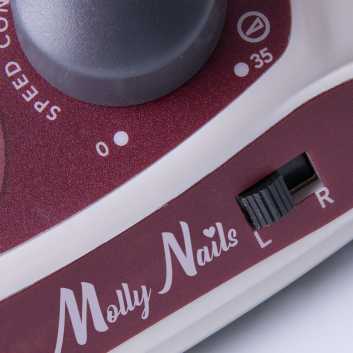 Frezarkę Molly Nails cechują niewielkie gabaryty przy idealnie wyważonym ciężarze, gwarantującym jej stabilność. Stylizowany na vintage wygląd urządzenia został dopracowany w najdrobniejszym szczególe – rączka frezarki ma kolor srebrno-śliwkowy, podobnie jak elementy korpusu bazy.