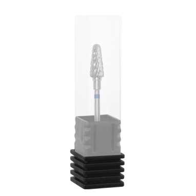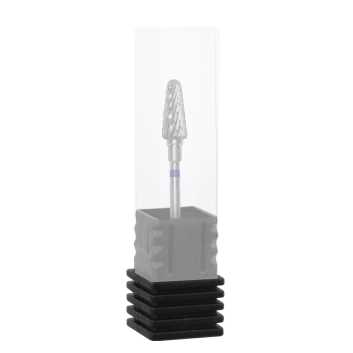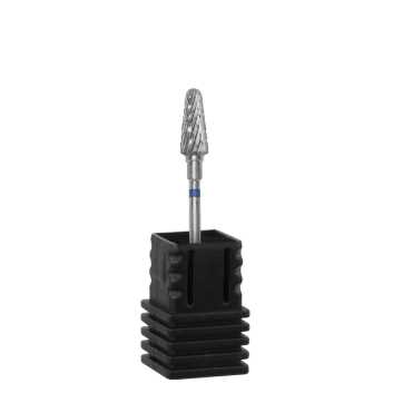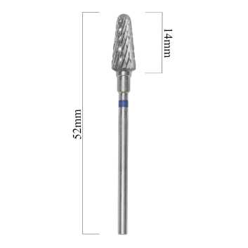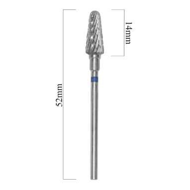 Niebieskie nacięcie o średniej ziarnistości, wskazuje na średnie cięcie proste i krzyżowe (o twardości frezu świadczy liczba i głębokość ostrzy). Kształt "szyszka" do korekty sztucznych paznokci, usuwania lakieru żelowego i twardych powłok.