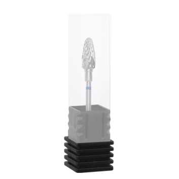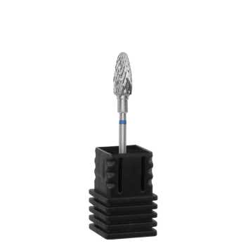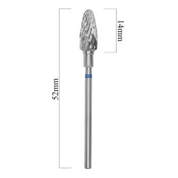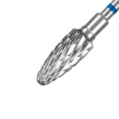 Niebieskie nacięcie o średniej ziarnistości, wskazuje na średnie cięcie proste i krzyżowe (o twardości frezu świadczy liczba i głębokość ostrzy). Kształt "kukurydzy" do korekty sztucznych paznokci, usuwania lakieru żelowego i twardych powłok.